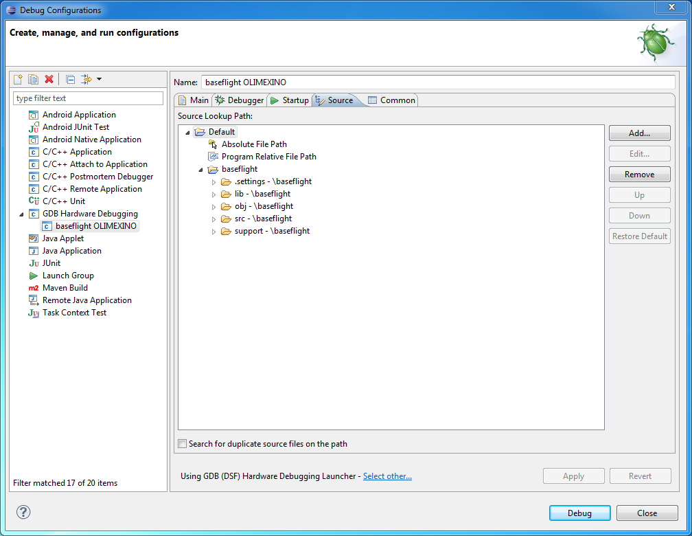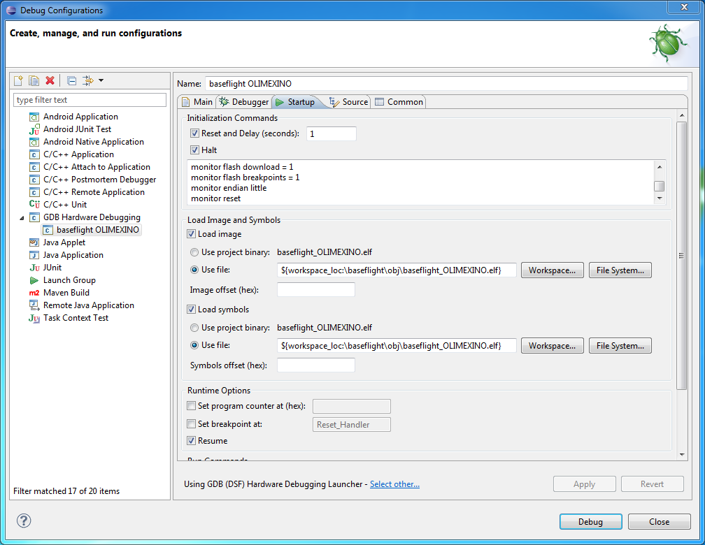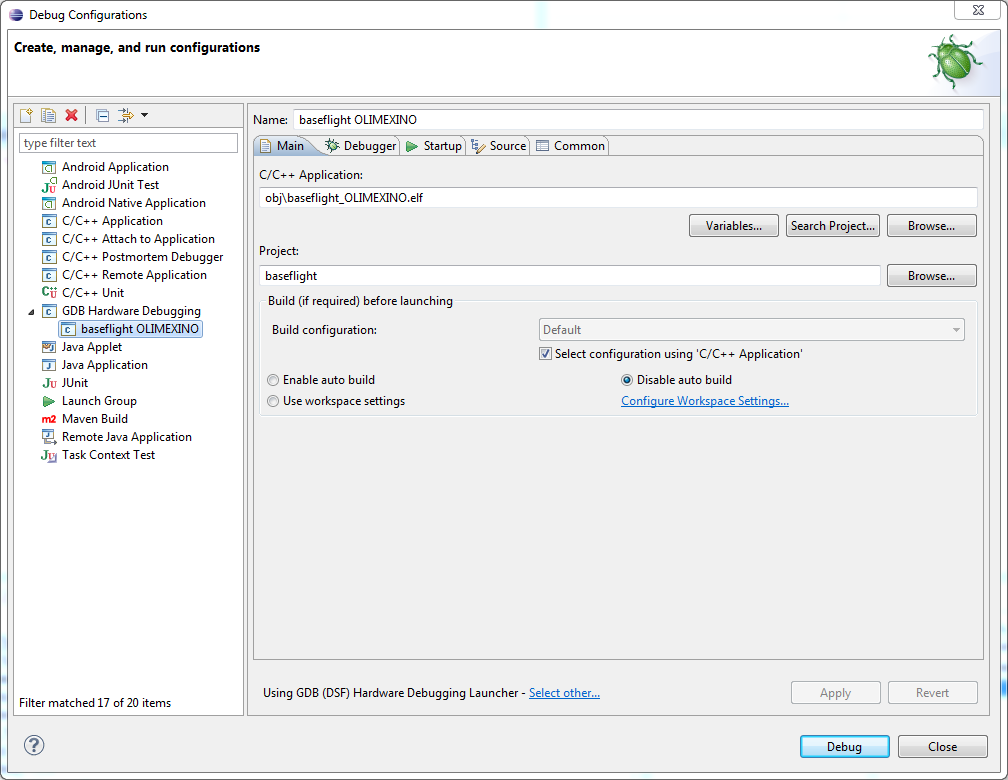 It's important to have build the executable compiled with GDB debugging information first. Select the appropriate .elf file (not hex file) - In these examples the target platform is an OLIMEXINO.